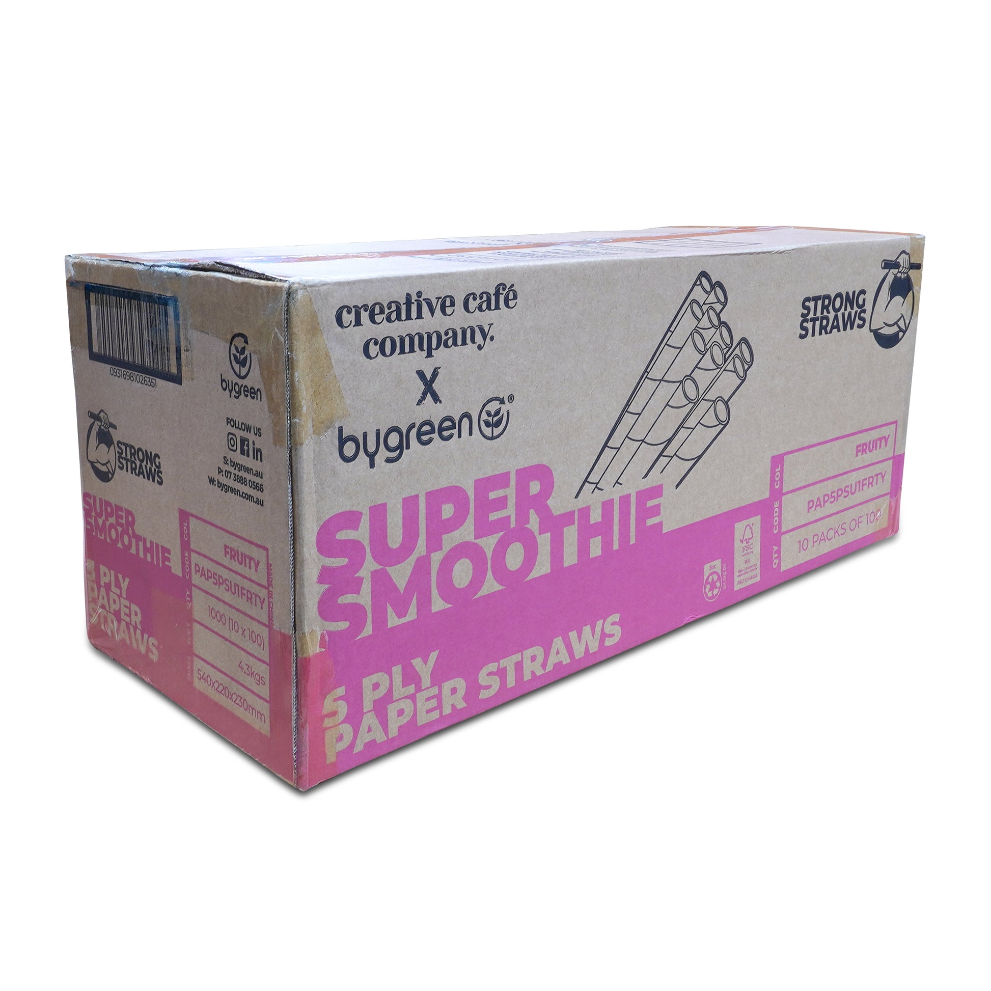 Add a burst of colour to every sip with our Super Smoothie Strong Straws in Fruity designs. Each straw is covered in vibrant fruit illustrations and built to handle thick smoothies, milkshakes, and other creamy drinks with ease. At 10.5 mm x 215 mm and made from 5-ply, food-grade paper sourced from well-managed, FSC®-certified forests and other controlled sources, they’re strong, fun, and fully home compostable — the perfect way to make every smoothie a little more exciting.