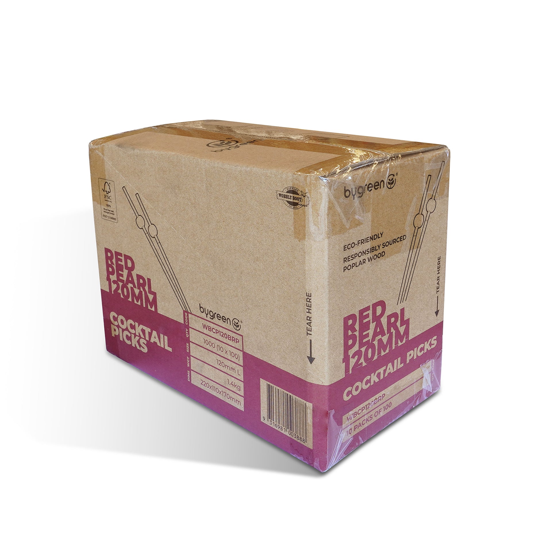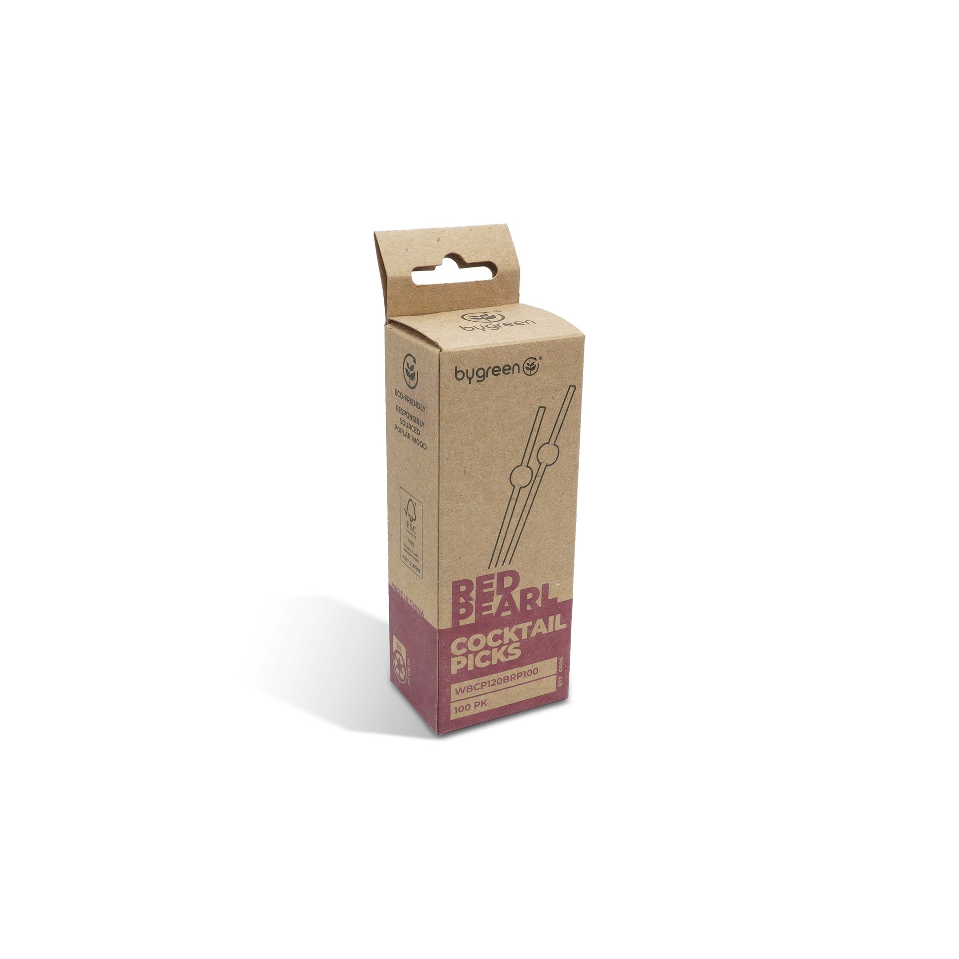 Red Pearl wooden cocktail pick by Wobbly Boot Barware. Sold in individual packs of 100 or a full carton of 20 packs of 100 (2,000 in total).