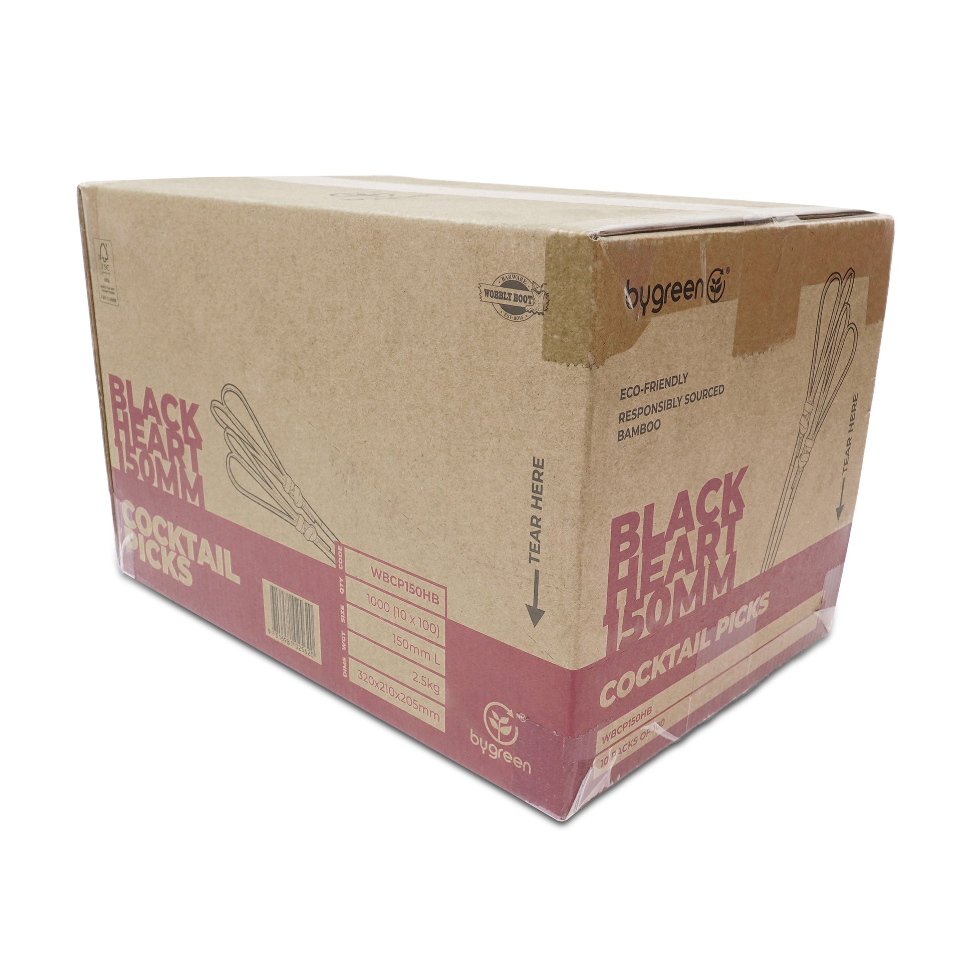 Black heart-shaped cocktail pick by Wobbly Boot Barware. Sold in individual packs of 100 or a full carton of 10 packs of 100 (1,000 in total).