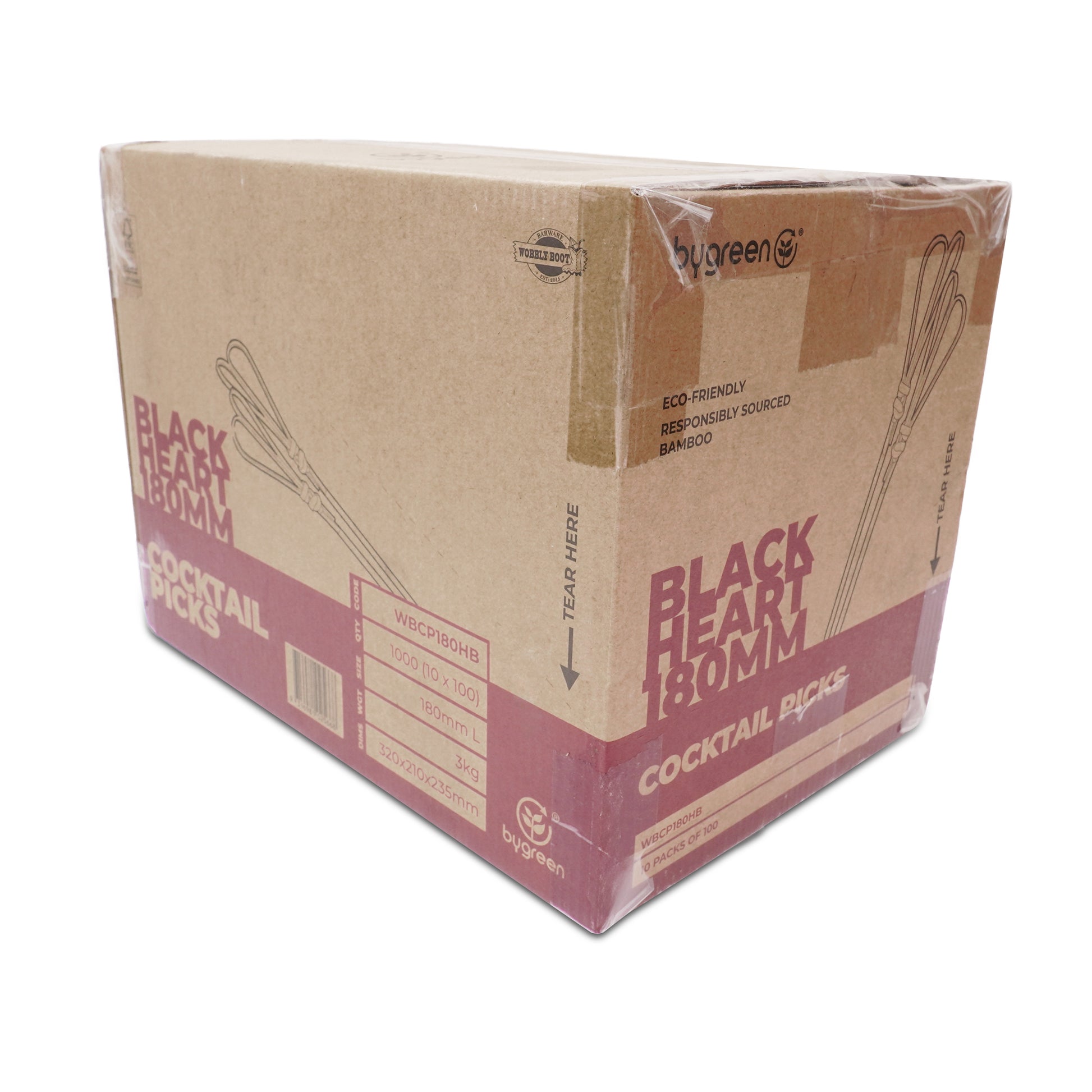 Black heart-shaped cocktail pick by Wobbly Boot Barware. Sold in individual packs of 100 or a full carton of 10 packs of 100 (1,000 in total).