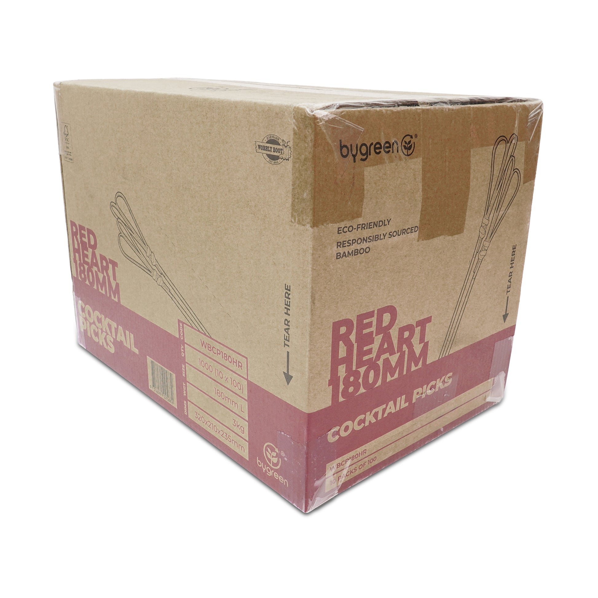 Red heart-shaped cocktail pick by Wobbly Boot Barware. Sold in individual packs of 100 or a full carton of 10 packs of 100 (1,000 in total).